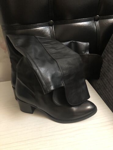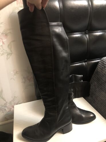 Qadın uzun temiz dəri çəkmə baha alınıb - Rəng: tünd qəhvəyi - Material: yumşaq dəridən, dekorativ iri tikişlər - Dizayn: dizə yaxın hündürlük, yan tərəfdə metal tokalı dekorativ kəmər - Daban: qa...