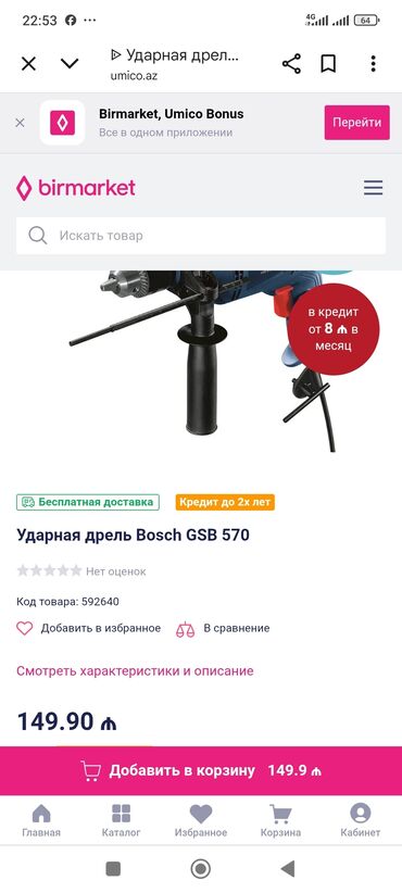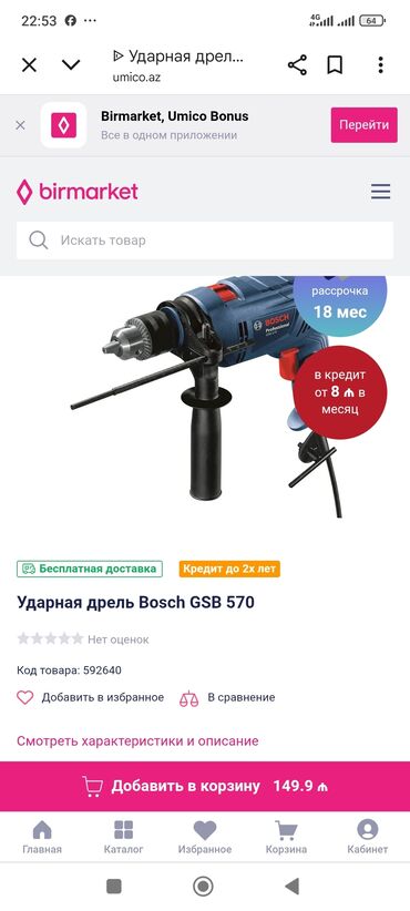 Yeni Zərbəli drel Akkumulatorlu, Pulsuz çatdırılma, Rayonlara çatdırılma, Kredit var