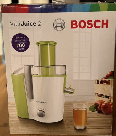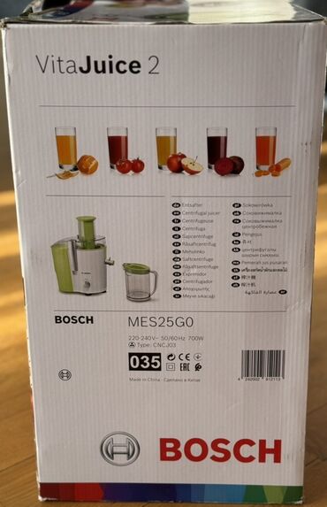 Sürətli şirə çıxarma üçün ideal; portağal, pomidor, alma, çuğundur, yerkökü və s. üçün uyğundur. BOSCH keyfiyyəti və praktik dizayn. Made in China. Type: CNCJ03. CE və EAC sertifikat işarələri qutuda göstərilib.