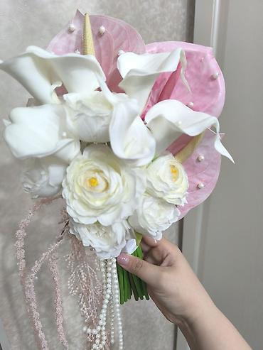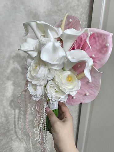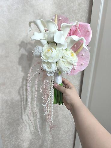- Tərkib: calla zanbaqları, ranunkulus/peyğəmbər çiçəyi dəstələri, anthurium yarpaqları (çəhrayı), dekorativ spadixlər