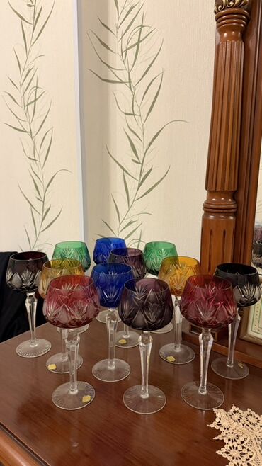 Rəngli sapqallı şərab qədəhləri dəsti - Material: şəffaf şüşə kasa, rəngli şüşə ayaq və altlıq - Rənglər: mavi, qırmızı, sarı, yaşıl, bənövşəyi və digər canlı tonlar (hər qədəhin ayağı fərqli rəng...