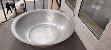 Böyük ölçülü metal leğən - Material: qalay/rəngsiz metal (alüminium tipli), yekparə döymə - Forma: dərin, geniş ağızlı, yumru - Kənarları qalınlaşdırılmış, möhkəm konstruksiya - Çoxfunksiyalı isti...