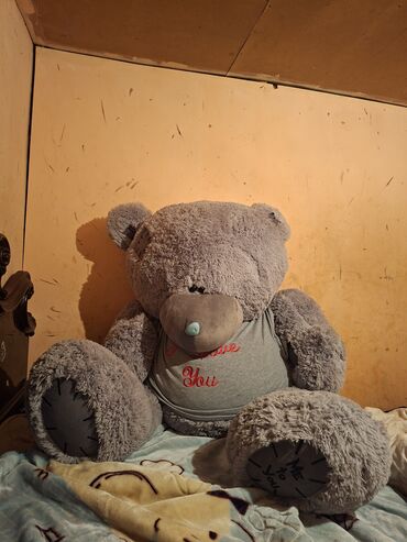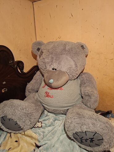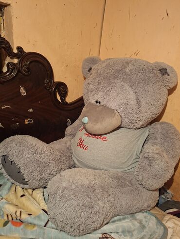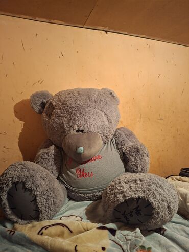 Böyük ölçülü peluş ayı oyuncağı - Rəng: boz - Üzərində boz köynək: “I
