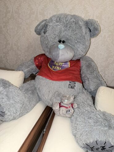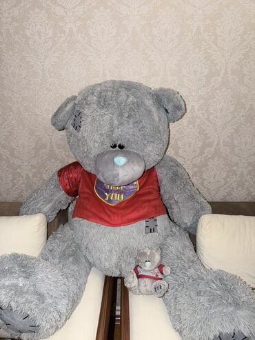 Nəhəng yumşaq oyuncağ ayı – boz rəngdə, qucaq dolusu ölçüdə. Ayı
