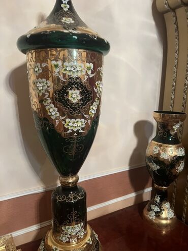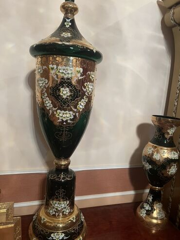 Böyük dekorativ vaza dəsti - Material: qalın şüşə - Rəng və işləmə: qızılı metalik örtük, yaşıl şüşə hissələr və 3D effektli, relyef çiçək naxışları (əl işi boyama, bəzək xətlərində qızılı konturl...