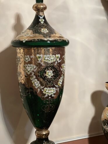 Şüşə dekorativ vaza - Material: qalın, keyfiyyətli şüşə - Rəng: zümrüd-yaşıl əsas, qızılı metallik haşiyələr və bəzəklər - Dizayn: əl işi kimi görünən relyef naxışlar, qızılı fonda çiçək motivləri...