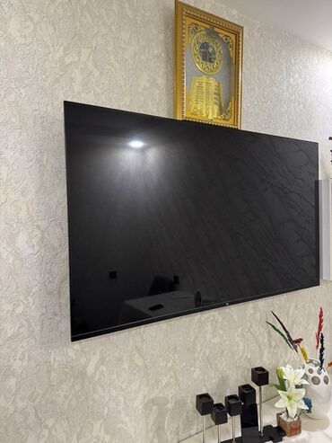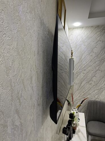 Divardan asılan, nazik çərçivəli böyük ekran televizor. Xüsusiyyətlər: - Təxminən 50–55 düymlük düz ekran - Nazik metal/silver alt çərçivə, minimalistik dizayn - Divar üçün montajlı (braketlə asıl...