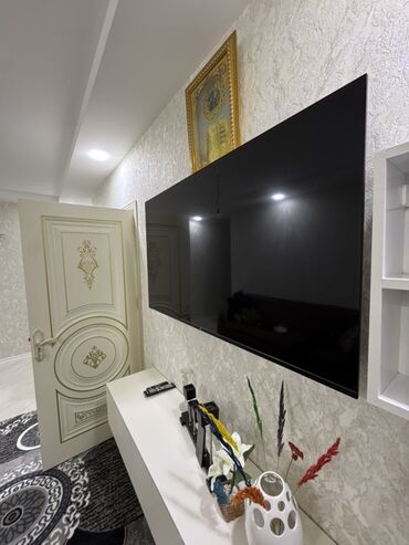 Divara quraşdırılmış böyük ekran televizor. - Təxmini ölçü: 140 ekran düym arası, nazik çərçivəli düz ekran - Montaj: divar asqısı ilə quraşdırılıb - Rəng: qara korpus, minimalist dizayn - Girişlə...