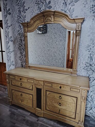 Klassik üslubda böyük güzgülü makiyaj/tuvalet masası - Material: massiv ağacdan hazırlanmış, oyma dekorlu və naxışlı fasadlar, qoz rəngli lak örtük - Komplekt: iri ölçülü dekorativ çərçivəli güzgü...