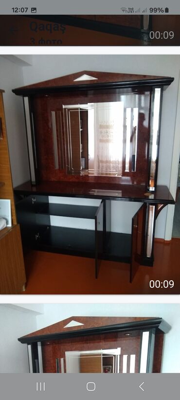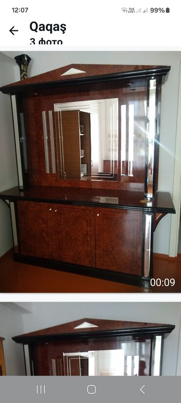 Məhsul: Taxta mebel dəsti və daxili qapılar - Divar boyu modul şkaf: 2 hissədən ibarət iri kompozisiya. Üst bölmələrdə dumanlı şüşəli vitrin qapıları, içəridə rəflər. Orta hissədə açıq niş sahələr...