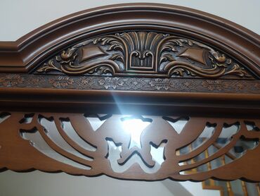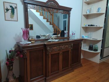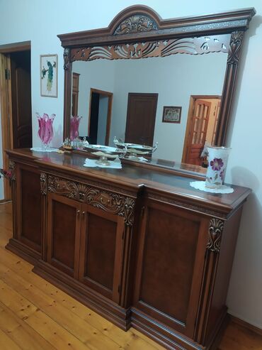 Klassik üslubda massiv taxtadan vitrina-komod və iri güzgü dəsti. - Material: keyfiyyətli taxta, təbii ağac naxışları - Üslub: oyma dekorativ elementlər, ornamentli çərçivə və pilastrlar - Üst his...