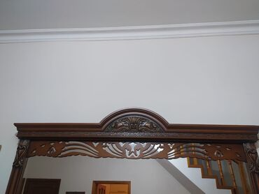 - Material: tünd qəhvəyi tonlarda ağac əsaslı konstruksiya, relyefli oyma dekor elementləri və profil haşiyələr