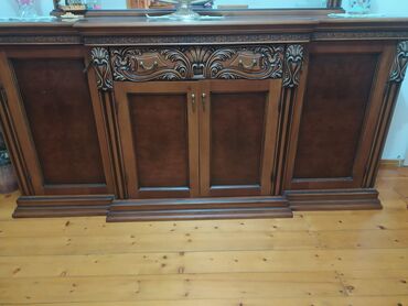 Qonaq otağı mebeli stol stulu da var Zərif naxışlar və vitrin bölmələri ilə bəzədilmiş, güzgü daxil olmaqla, tünd qəhvəyi rəngli taxta bufet dəsti. Dəst iki hissədən ibarətdir: güzgülü bufet və vit...