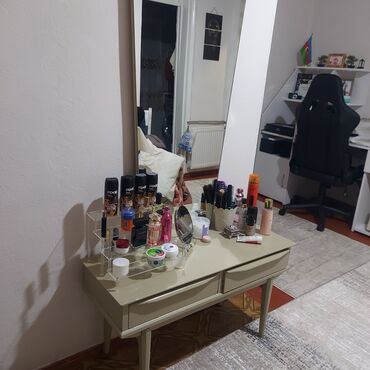 Qeyd: Şəkildə görünən kosmetik məhsullar, fırçalar və digər aksesuarlar təqdimata daxildir/göstəriş məqsədlidir; elan yalnız masa və güzgünü təsvir edir. Ölçülər təxmini: masa hündürlüyü orta, uzunluğu iki çekmece eni boyda; güzgü masa üstündən tavana yaxın hündürlükdə.