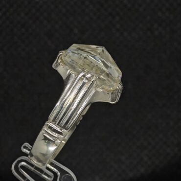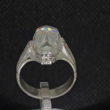 - Üst hissədə iri, tebii dag bülluru rose cut kəsimli şəffaf daş. Yüksək qaldırılmış oturtma sayəsində işığı güclü şəkildə əks etdirir.