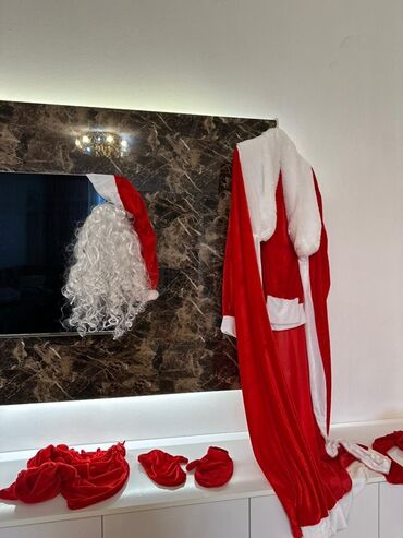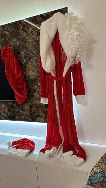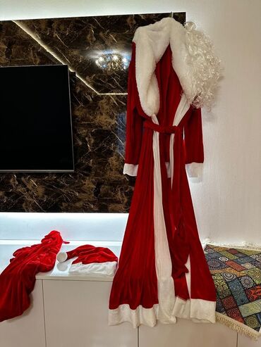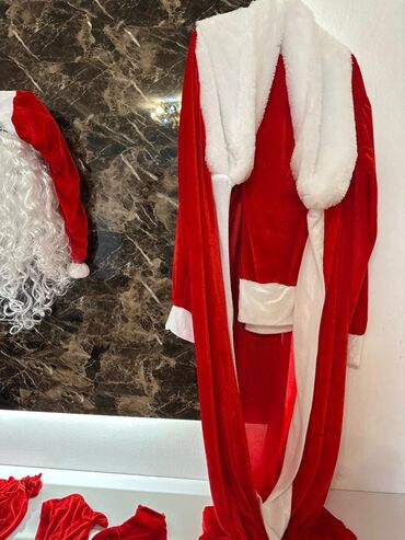 Şaxta Baba kostyumu - Tam komplekt: qırmızı uzun xalat (ağ süni kürk haşiyəli), ağ uzun saqqal-parik, ağ şapka (bəzəkli emblemlə), qırmızı əlcəklər. - Material: yumşaq məxmərə bənzər parça və süni...