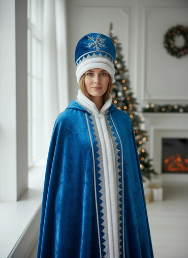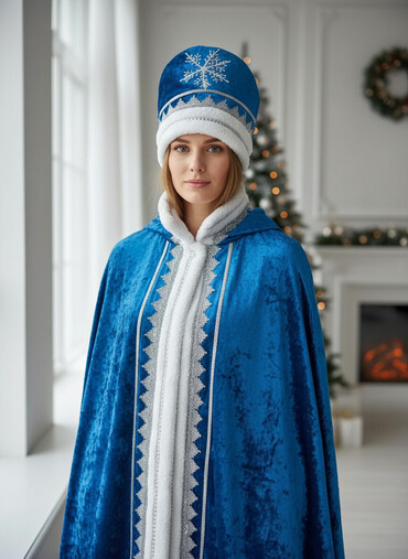 - Üstünlüklər: diqqətçəkən parıltı, tematik qar dənəsi motivi, tamamlayıcı papaq və astar, bayram və karnaval obrazı üçün ideal komplekt