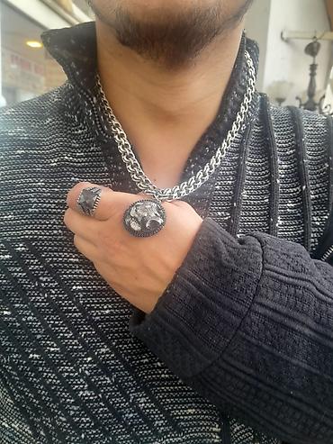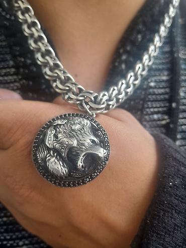 "Canavar Dişi" temalı boyunbağı Boz qurd motivli asma boyunbağı - Material: metal zəncir və metal örtüklü asma hissə, diş/sağanaq formalı ağ asma - Dizayn: asma hissə üzərində detallı “qurd başı” ...