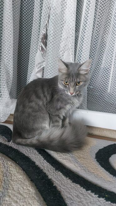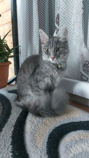 Məhsul: Ev pişiyi - Növ: uzun tüklü ev pişiyi - Rəng: boz (gümüşü çalarlarla), qarın və sinə zonasında daha açıq tonlar - Gözlər: sarı-qızılı - Boyunbağı: qırmızı lentli - Xüsusiyyətlər: yumşaq və...