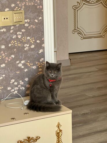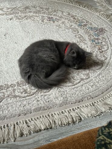 Məhsul: Ev pişiyi - Növ: uzun tüklü ev pişiyi - Rəng: boz (gümüşü çalarlarla), qarın və sinə zonasında daha açıq tonlar - Gözlər: sarı-qızılı - Boyunbağı: qırmızı lentli - Xüsusiyyətlər: yumşaq və...