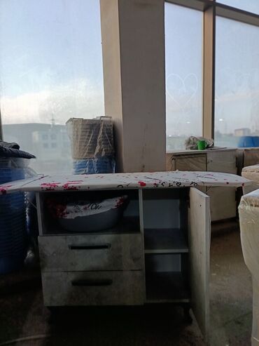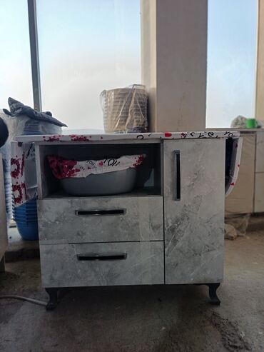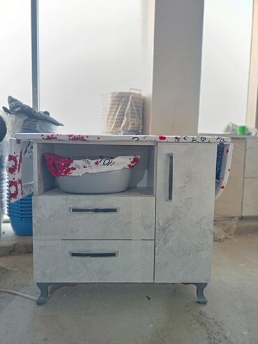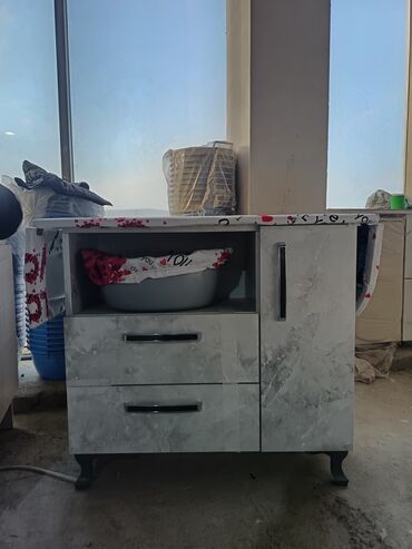 - Üst hissə: geniş masa səthi (mühafizə plyonkası üzərindədir), qab-qacaq və ya lavabo quraşdırması üçün uyğundur