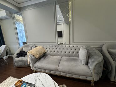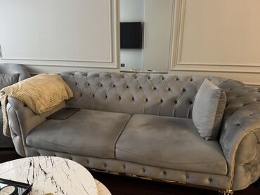 Zərif klassik dizaynlı, boz rəngdə məxməri üzlü üçyerlik divan.