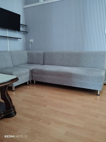 Ölçülər şəkillərə əsasən təxmini genişdir; geniş oturma və uzanma rahatlığı təklif edir. Boz tonu interyerdə sakit və səliqəli görünüş yaradır, metal ayaqlar isə müasir vurğu əlavə edir.