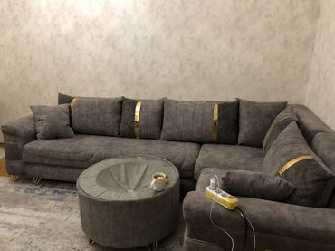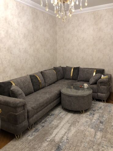 Boz rəngli L formalı yumşaq künc divan və uyğun yuvarlaq jurnal masası.