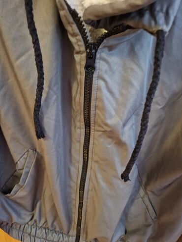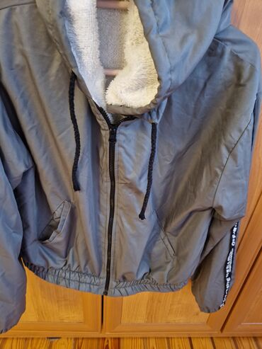 Boğazlığı qalın şerpa (ağ tüklü) astarlı, kapüşonlu boz rəngli qışlıq jaket.