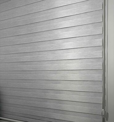 2 eded Zebra jalüz pərdə – gümüşü/boz rəngdə, teksturalı parçalı. İkiqat (şəffaf və sıx) zolaqlı quruluş sayəsində işıq axınını tənzimləmək və məxfiliyi artırmaq mümkündür: zolaqlar üst-üstə gətirildikdə otaq qaranlıqlaşır, paralel olduqda işıq keçirir.