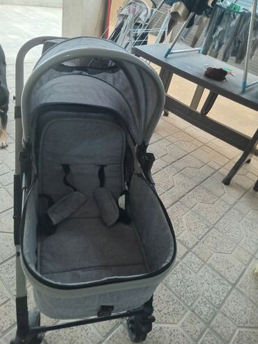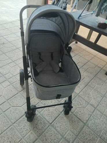 Uşaq arabası – boz rəngli, bərkidilən beşik tipli oturacaqla.