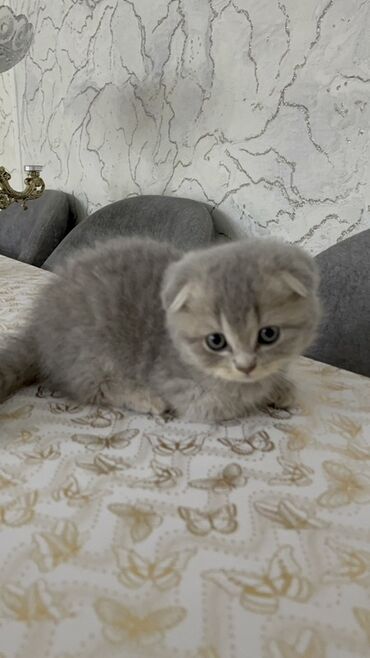 Skotiş Fold (Scottish Fold) bala pişik - Rəng: vahid boz (blue/grey), qısa, sıx və ipək kimi yumşaq tüklər - Qulaqlar: tipik “fold” – irəliyə doğru yığılmış - Gözlər: iri, kəhrəba tonlarında, ifad...