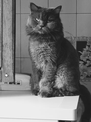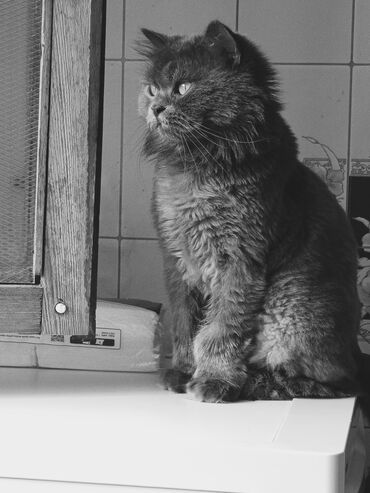 Qeyd: Şəkildəki pişik boz-monoxrom rəng palitrası və uzun tüklü quruluşu ilə diqqət çəkir; sakit, mülayim xarakterli ev pişiyi aurası verir.