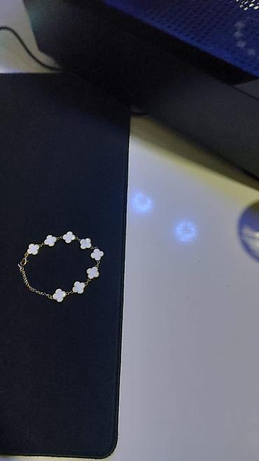 Qızıl qolbaq – dörd yarpaqlı çiçək elementləri - Material: 585 əyarlı qızıl (etiketdə “585” damğası görünür) çəki 5.23qram - Dizayn: Zəncir boyunca yerləşdirilmiş çoxsaylı dörd yarpaqlı çiçək pand...