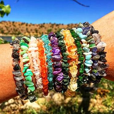 Təbii daşlardan hazırlanmış elastik bilərziklər dəsti - Material: cilalanmış təbii daş qırıntıları, elastik ip - Növlər: 1) Qızılqum (goldstone) – isti tünd-qəhvəyi rəng, səthində intensiv parıl...