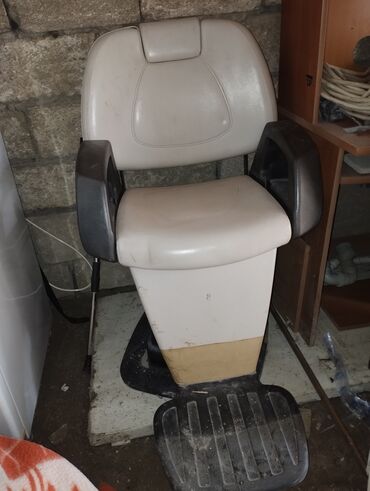 Bərbər kreslosu, açıq rəngli oturacaq və kürək dayanağı, tünd rəngli qoltuqaltıları və qara oturacaq bazası ilə. Bu kreslo, bərbərxanalar, salonlar və ya oxşar müəssisələr üçün funksional həll təqdim edir. Oturacaq hissəsi geniş və rahatdır, alt tərəfində ayaq qoymaq üçün platforma mövcuddur.