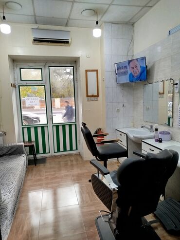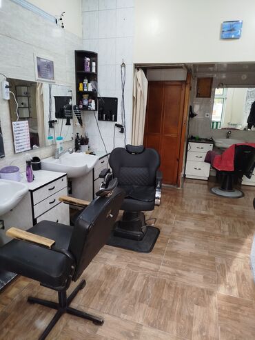 - İki peşəkar barber kreslosu, geniş güzgülər və yuma lavaboları