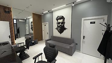 Kişi bərbər xidməti Salon 7 dənə məkdəb yolunun usdudur aktif yerdir - Müasir dizaynlı bərbərxana məkanı: böyük divar güzgüləri, rahat hidravlik bərbər kresloları, mərmərə bənzər iş masasının üst...