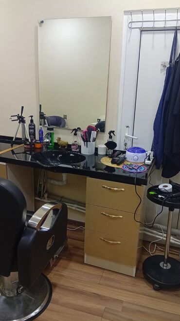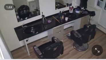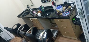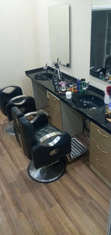Gözəllik salonu və bərbərxana üçün hazır işlək set: oturacaqlar, güzgülər, lavabolar və saxlama mebelləri bir yerdə. İşıqlandırma və aksesuarları yerləşdirmək üçün üst səth genişdir.