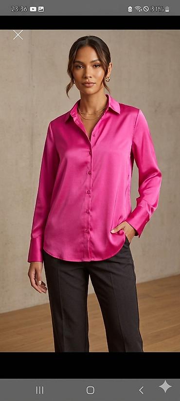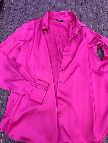Məhsul: Qadın köynəyi - Rəng: Parlaq çəhrayı (fuşya tonunda) - Parça: Yumşaq, axıcı teksturaya malik parıltılı/saten effektli toxuma - Dizayn: Klassik düyməli model, rahat kəsim - Yaxa: Geniş və i...