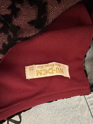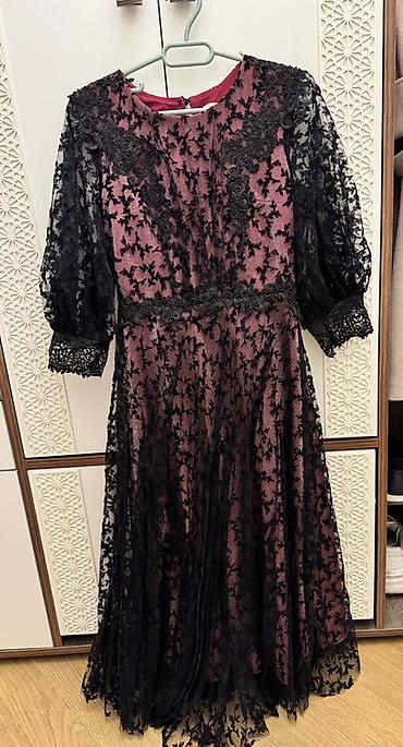 Zərif ziyafət/libas. İç hissə şərab-qırmızı rəngdə atlas/şifon astarlı, üstü qara gipür və məxməri aplikasiyalarla bəzədilmiş tül qatlı dizayn. Yuxarı hissədə və bel xəttində incə krujeva işləmələri, üçrəqəm (təxminən 3/4) şiş puff qol forması və qollarda krujeva manjet detalları. Boyun xətti qapalı (crew neck), arxa hissədə gizli fermuar. Etek hissəsi çoxqatlı, axıcı və fırfırlı, uzunluq isə maxi. Rəng kontrastı və naxışlı tül qatı sayəsində xüsusi günlər, nişan, mərasim və dəvətlər üçün uyğundur.