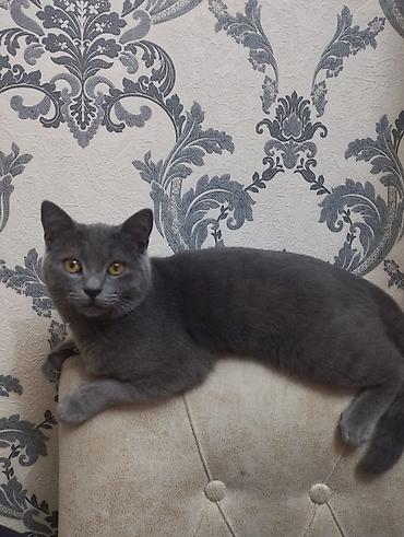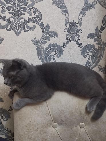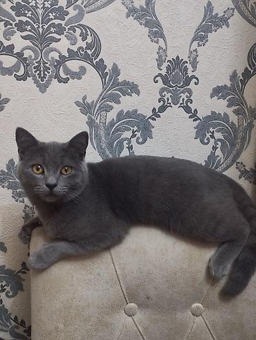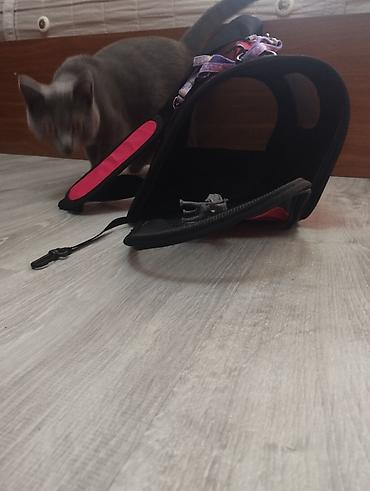 Saf-boz tüklü pişik – Britan tipli görünüş, qısa və sıx yun, yumru baş və balaca qulaqlar, kəhrəba rəngli gözlər. Orta ölçülü, çevik və sakit xasiyyətlidir, ev şəraitinə uyğundur. Şəkillərdə daşınma çantası/daşıyıcı və qoşqu-kəmər də görünür.