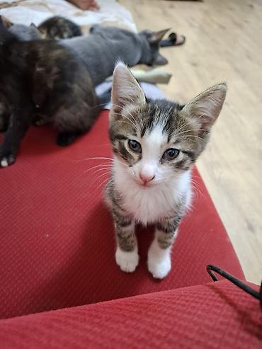 Brit Shortheir tipli, ağ-krem rəngdə, zolaqlı naxışları və qısa, sıx tükləri olan balaca pişik. 6 ayliqdi agilli oynagan pisikdir. ustunde qum qabisi,qaragi yemey qabisi verilecey. peyvendi vurulub...