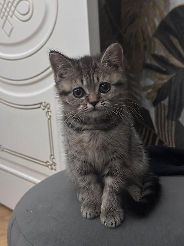 Brit qısa tüklü tipində, boz-çəkili zolaqlı balaca pişik balası.