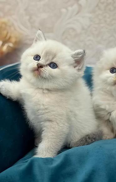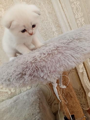 Britan tipli (Scottish Fold tərzinə bənzər, yumulmuş qulaqlı) ağ balaca pişik balası. Xüsusiyyətlər: - Rəng: tam ağ, çəhrayı burun və yastıcuq pəncələr - Qulaqlar: yumulmuş (fold) - Gözlər: iri, b...