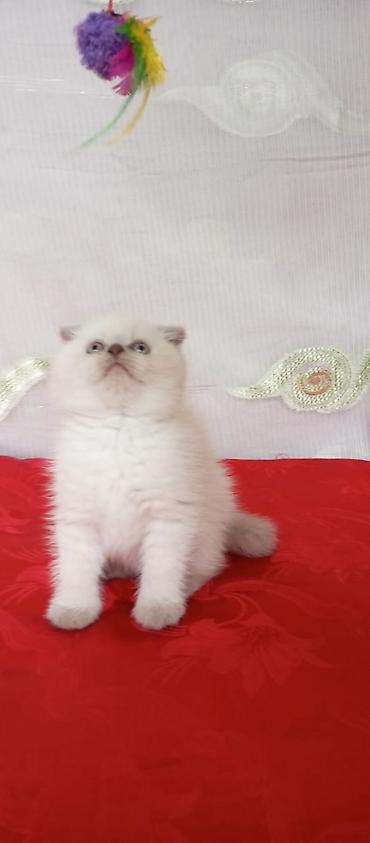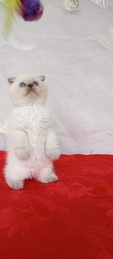 Skottış Fold balası – ağ rəng, qısa tüklü, yumşaq və sıx örtük. Yarıqlanmış (qatlanmış) qulaqlar, iri mavi gözlər, balaca çəhrayı burun. Sakit və mehriban xasiyyətli, qucağı sevir, ev şəraitinə uyğ...