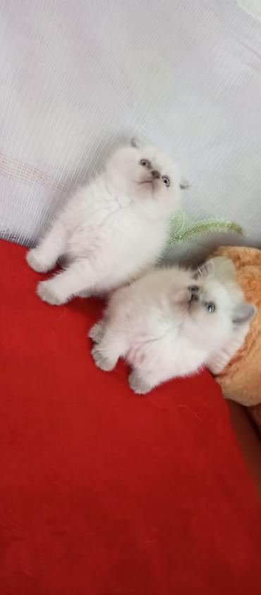 Britaniya Şotland tipli pişik balaları - Cins: Scottish Fold/Scottish Straight xətti (ana – qıvrıq qulaqlı, balalarda həm qıvrıq, həm düz qulaqlı var) - Rənglər: ağ (snow white) və krem/boz (blue-...