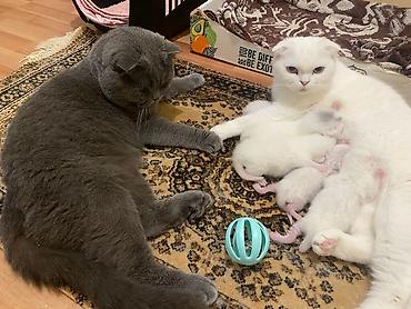 - Valideynlər: boz rəngli Britaniya qısa tüklü ata (sərt quruluşlu, yumru baş, kəhrəba gözlər) və ağ rəngli Scottish Fold ana.