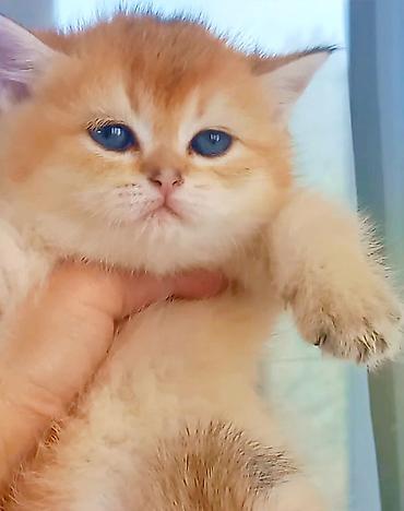 British qızıl rəngli pişik balası - Cins: British Shorthair (golden shaded/shell rəng) - Yaş: təxminən 1–2 ay - Xüsusiyyətlər: iri mavi-boz gözlər, yumşaq sıx tüklü kürk, yuvarlaq baş və kiçik qul...