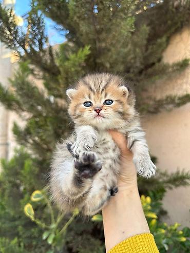 Britan tipli qısa tüklü balaca pişik balası - Rəng: qızılı–şabalıdı (golden), qarın və pəncələrdə açıq krem tonları - Gözlər: böyük, dairəvi, mavi-boz çalar - Tüklər: yumşaq, sıx, pofuduk tekstura...